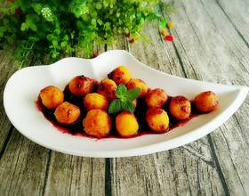 倒上调好的蓝莓酱,这款蜂蜜蓝莓红薯球就做好了。