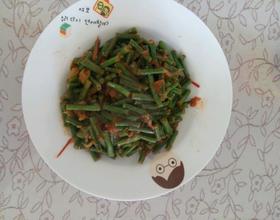 然后放入豆角翻炒,放少量酱油,翻炒,然后加点水