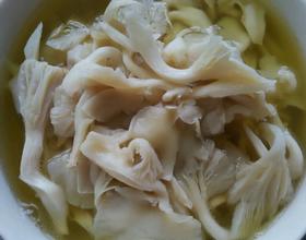 下菌子,煮开,放适量猪油和盐,再开才能搅动,不然会有生油味