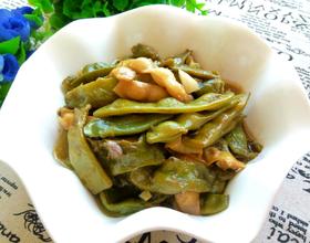 - 8. 炒至豆角发蔫,加入温水,水位和豆角一平就可以,盖盖好锅盖小火开始炖