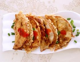 - 4. 锅中烧热油,用筷子试验温度:待放入筷子后,其周围产生小的油泡时表示油温正合适,小心地下入茄盒,将茄盒炸至两面金黄时即可出锅。