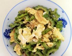 把鸡蛋盛起来,清洗炒锅后放油,油热后放入葱花,爆香后再把苦瓜回锅
