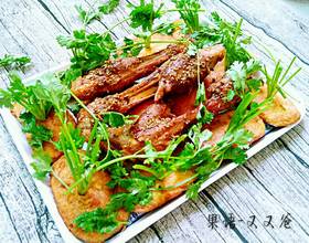 - 10. 盘里铺垫一层炸馒头片,将炸好的羊腿放在馒头片上,把熟芝麻撒在羊腿上。用香菜铺满四周。