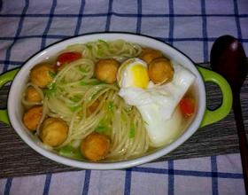 面条煮熟放入炸好的鱼丸,(记得撇去锅中的浮沫)。