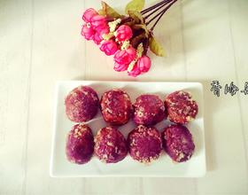 - 17. 盘子里先放张吸油纸,然后把紫薯球放在盘子里