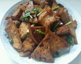 把锅里放油,烧热放花椒,八角,五花肉,葱翻炒一下