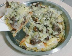 再铺上事先用盐和胡椒粉调味好的牛肉。