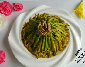 加入黄花菜,加入少许盐,糖,蚝油,生抽调味炒匀即可出锅