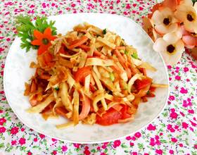 翻炒几下放入火腿肠丝和饼丝继续翻炒