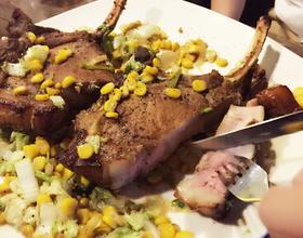 - 4. 锅中放入黄油融化,放蒜,放入猪排煎至两面都熟了,中间还是生的。猪排取出,用剩下的油把玉米白菜香芹一起炒熟,加入十三香盐调味,备用