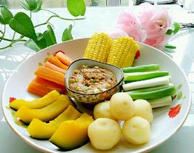 把所有的摆在盘里,中间加一碗蒸鸡蛋酱即可