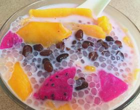 取适量备好的西米放入器皿中,放入芒果和火龙果和红豆。