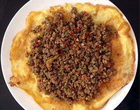 把炒好的牛肉泥放入煎好的蛋上即可