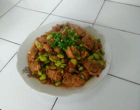 翻炒均匀后加入青豆炒然后加入适量的水一起炖