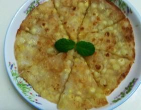热锅下少量的油滑锅,关火,放入拌好的玉米粒,铺平用锅铲轻轻压平,开小火慢慢煎制,加少量的水,锅顺火慢慢转动,确保受热均匀搽抹