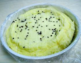 - 8. 电饭锅涮一小层油,将搅拌好的材料倒入即可,按下电饭锅煮饭键,跳至保温用毛巾捂住出气口20分钟,再按煮饭键,跳至保温后再用毛巾捂20分钟,简简单单的电饭锅版蛋糕完成,看起不咋样,亲试,特别松软,绝对的蛋糕味道。