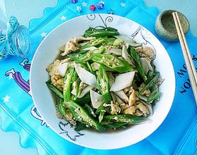 另起油锅,油烧热加入秋葵,爆炒至变色。