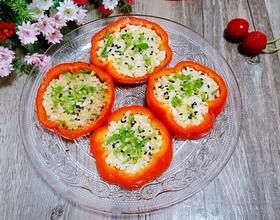 锅中加入适量的油,把彩椒圈放在锅里面,把米饭饼饼放入彩椒圈里面,慢慢的煎,等到变色后就可以出锅喽
