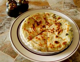 - 8. 平底锅中加适量的油,油热后将擀干的饼放入,用中小火煎盖好煎到金黄翻面,把两面都煎至金黄即可。