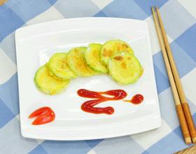 取一片西葫芦片,两面沾上干淀粉,抖抖多余的干粉