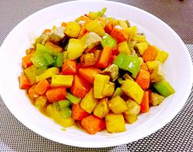 加炸熟的土豆丁胡萝卜丁翻炒均匀