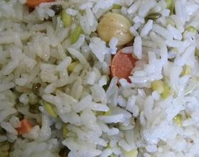 加一点油,炒热米饭,入鸡蛋,胡萝卜,鱿鱼,豆芽等,盖锅找小火焖两分钟,盛起,加黑芝麻点缀