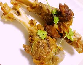 两根羊骨,拿出来控干水份后,摸上了买的烧烤酱,15分钟后入味后,锅里放油,放羊骨炸后,出锅撒上孜然粉就好了!