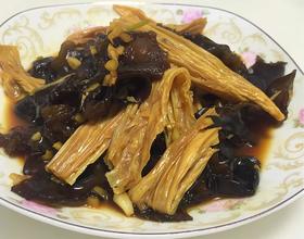 将腐竹和木耳倒进锅中翻炒。