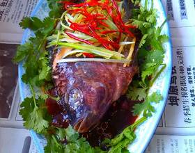 鱼下面放葱叶、姜丝,鱼身上、肚子里也放些葱、姜、撒料酒