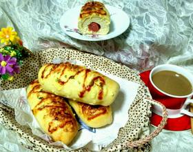 用擀面杖将面团擀成,长椭圆形,然后将烤肠,将香肠卷进去。我在里面也涂了一层沙拉酱。
