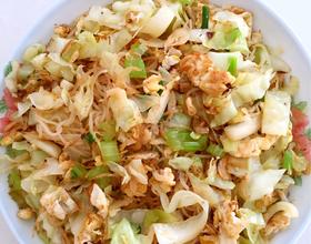 先把米粉放在水中浸泡至软,香葱洗净葱头葱花分别切碎,鸡蛋打入碗中,包菜洗净切好。