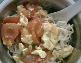拿碗,取一些面,番茄炒蛋,还有番茄汁拌面