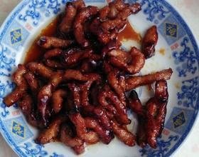另起锅烧热少许油,加冰糖熬化,放入肉条,加少许蜂蜜翻炒