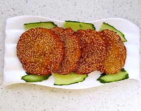 将南瓜面团直接按扁后两面沾上白芝麻。