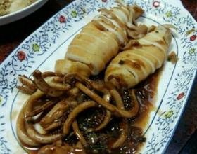 - 9. 捞出来鱿鱼切一段段的筒,把锅里的汁浇上去,撒些芝麻。
