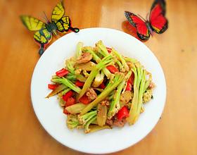 把刚才的五花肉片倒入花菜中一起翻炒