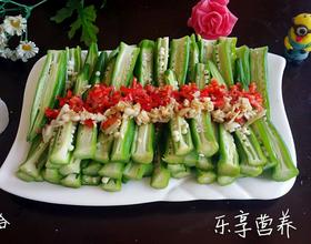 秋葵捞出后用纯净水过凉切成条,码放盘中,红辣椒切碎,蒜切末摆放在秋葵上面,淋入适量蒸鱼豉油,撒上少许盐