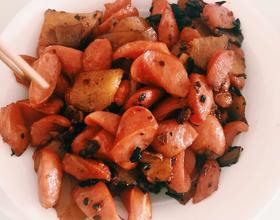 炒好土豆片后加入烤香肠,继续翻炒,小火不然容易糊