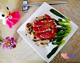 - 11. 煮至差不多干水时打开电饭锅盖,把香肠放进去。