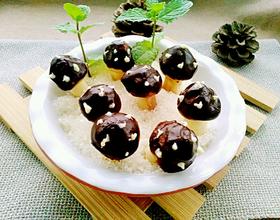 在取一个蘑菇,放在巧克力里,把蘑菇滚一圈就可以。