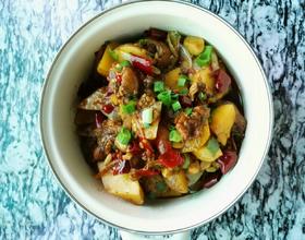 - 4. 底料炒香后加入鸡块翻炒至鸡块八分熟,再加入土豆块翻炒两份钟