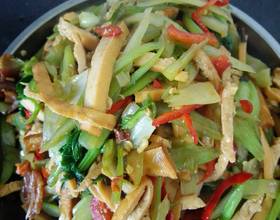 倒适量酱油翻炒,放入豆腐干炒至微軟,放芹菜片翻炒,放入红辣丝翻炒,放透量的盐翻炒,出锅