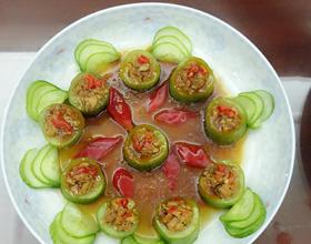 黄瓜切4cm长的段,将黄瓜籽掏空备用。红椒一部分切丁、一部分切菱形状。