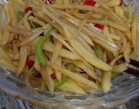 放入土豆丝后加盐,老抽,醋(适量,喜欢吃酸的可以多放些,放醋是为了让土豆丝吃起来脆脆的)。继续翻炒。然后。。。土豆丝出锅啦