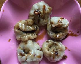 一次性塑料袋上沾取少量熟油 取糯米团包入适量红糖水 收口 沾取熟糯米粉 摆盘