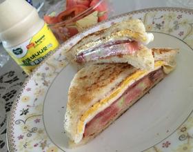 准备好所有食材以后就可以把食材放在一起了,首先在面包上抹上沙拉酱,我喜欢甜口的丘比特沙拉酱
