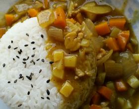 将菜都切成小丁,放入锅中爆炒一下,不用炒熟,不要放盐哦,咖喱饭有味道