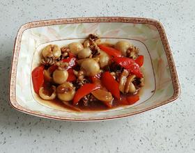 起油锅入红椒、蒜、姜煸炒片刻,加入墨鱼仔、豆瓣酱、蚝油煸炉一分钟,倒入水淀粉勾芡出锅。