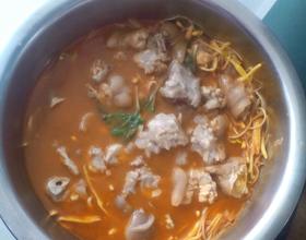 在另外一口锅内放入豆牙打底,放上压好的猪脚,在倒入制好的红酸汤,撒上香菜葱节,即可