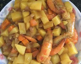 炒出香味加入处理好的虾炒至变色。加适量水 烧开后关火加入咖喱搅拌至融化。